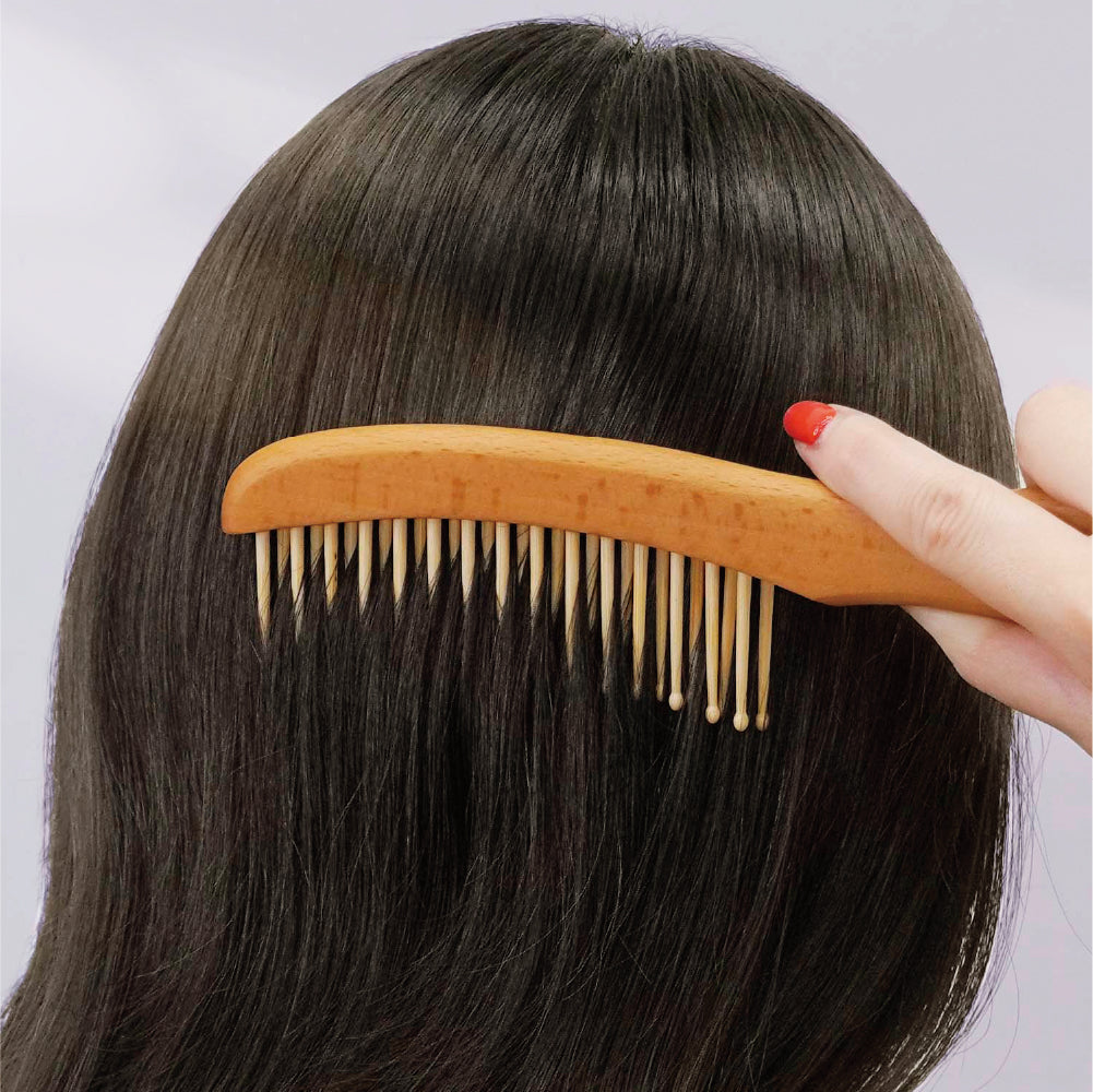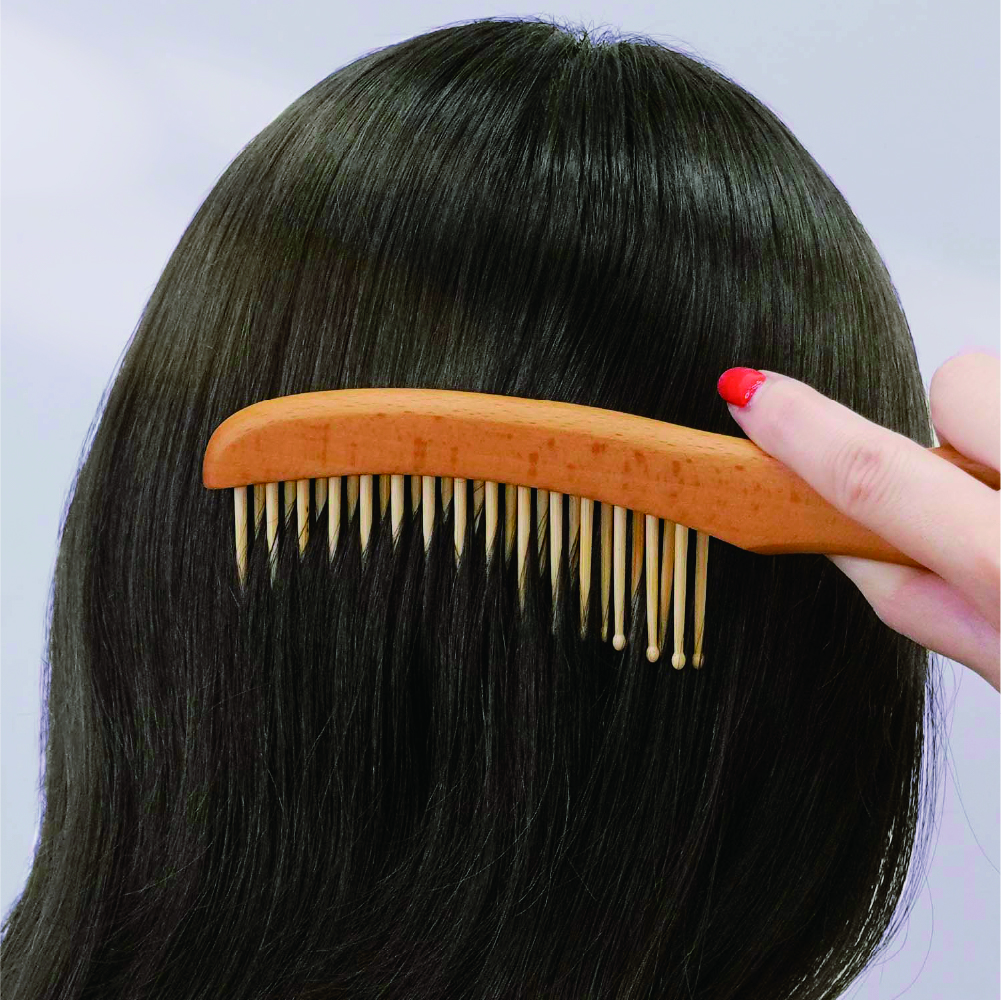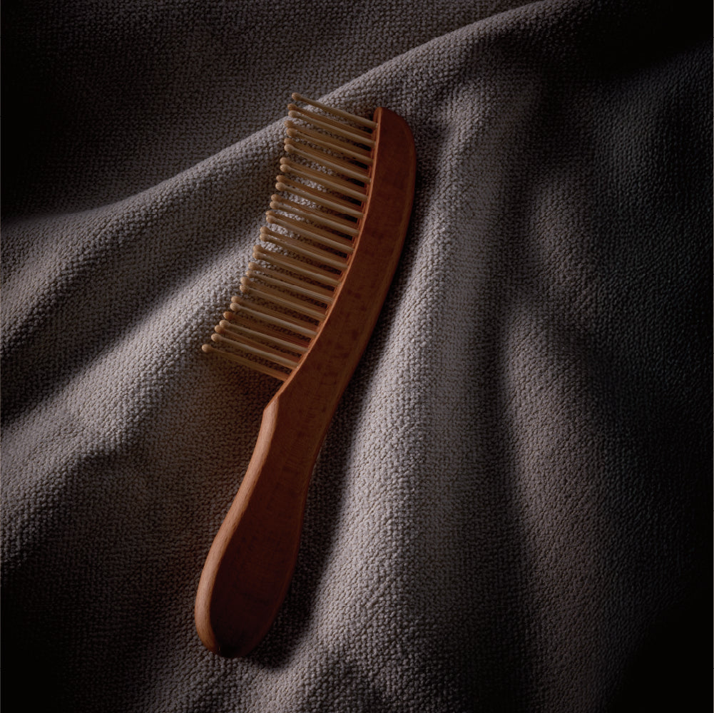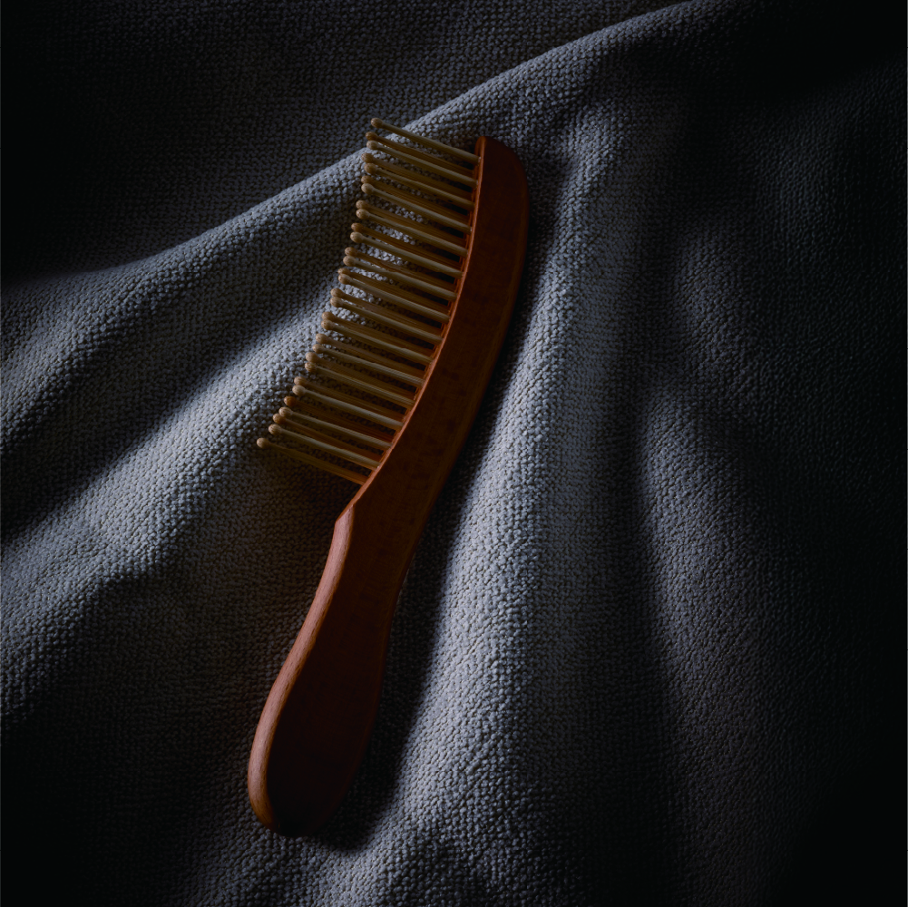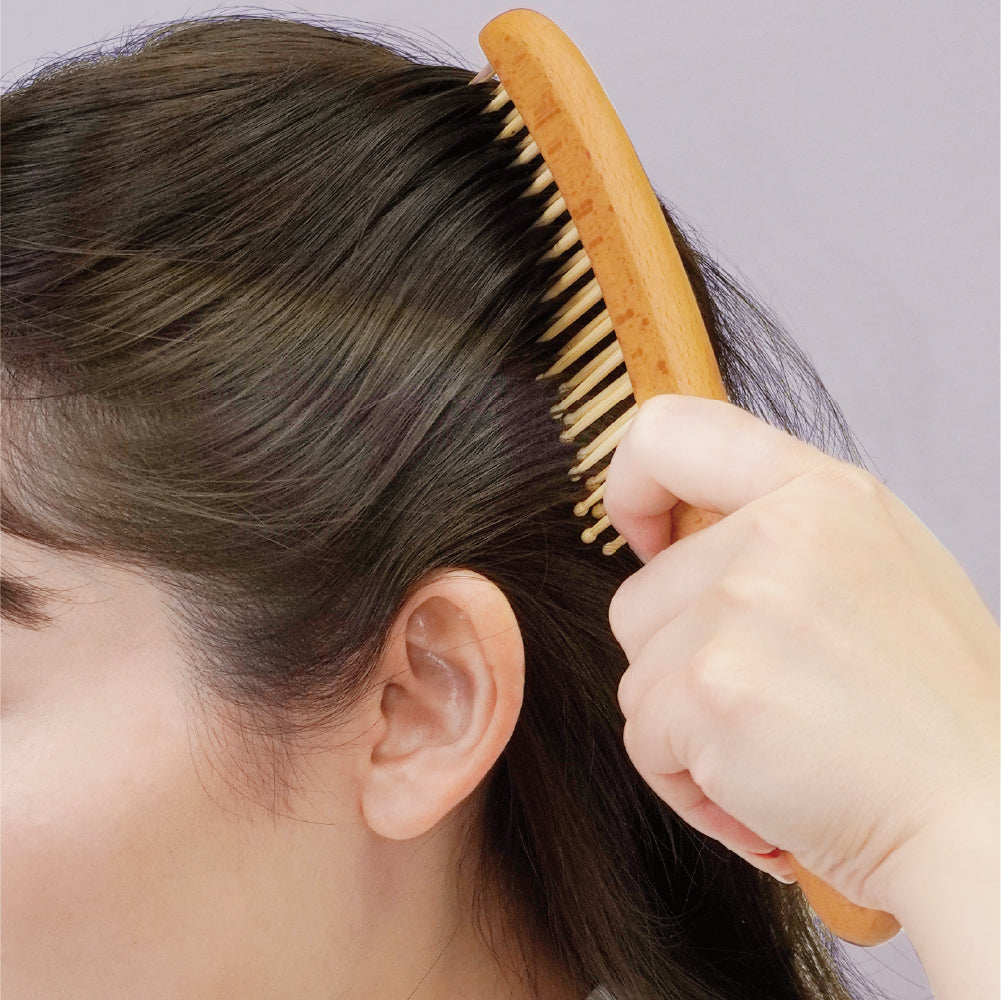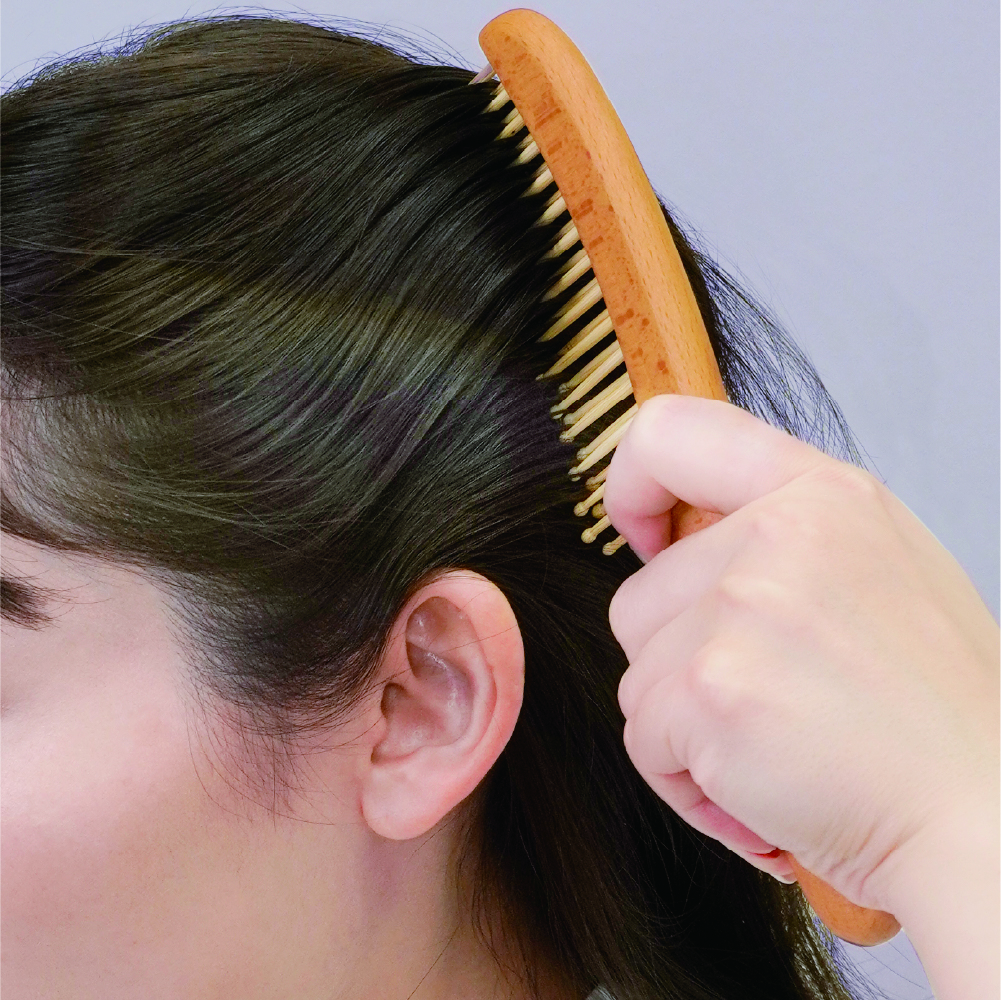 櫛の部分には、天然の油分を豊富に含む竹を使用。使い続けることで、竹の油分や普段お使いのヘアオイルがブラシに馴染みます。梳かすたびに髪に自然なツヤを与え、あなただけの特別な一本に育っていきます。